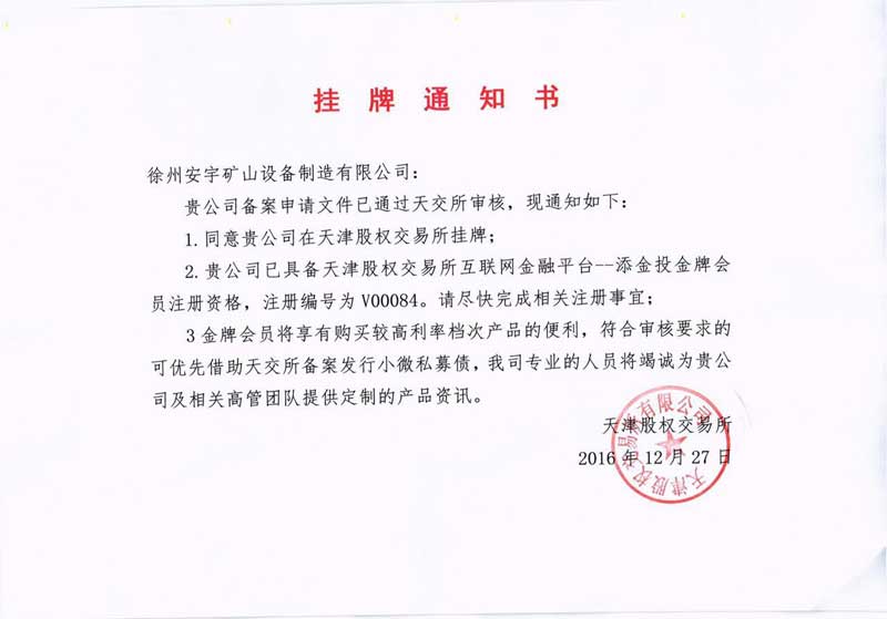 熱烈慶祝徐州安宇礦山設(shè)備制造有限公司(以下簡稱:徐州安宇),于2016年12月30日,備案申請文件已通過天交所審核,成功在天津股權(quán)交易所掛牌,我公司已具備天津股權(quán)交易所互聯(lián)網(wǎng)金融平臺—添金投金牌會員注冊資格,注冊編號為V00084。(徐州安宇股權(quán)交易代碼:300280)。
