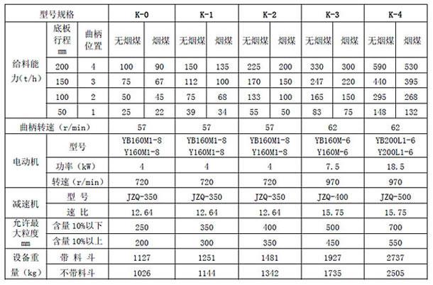 K 型給煤機(jī)由機(jī)架、底板(給煤槽)、傳動平臺、漏斗、閘門、托輥等組成。當(dāng)電機(jī)開動后經(jīng)彈性聯(lián)軸器、減速機(jī)、曲柄連桿機(jī)構(gòu)拖動傾料5°的底板在輥上作直線往復(fù)運(yùn)動,煤均勻地卸到其他設(shè)備上。